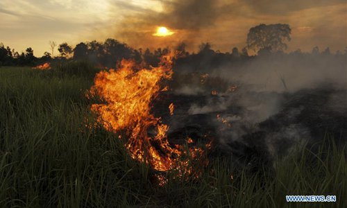 Photo taken on July 20, 2019 shows peatland fire at Payung Sekaki, Pekanbaru, Riau, Indonesia. A joint team from local firefighters, police and military officers tried to extinguish forest fire several days ago. (Xinhua/Hadly Vavaldi)