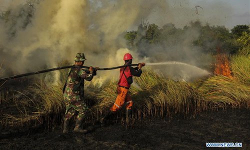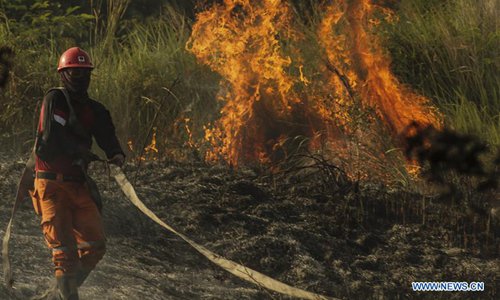 An Indonesian firefighter tries to extinguish peatland fire at Payung Sekaki, Pekanbaru, Riau, Indonesia, July 20, 2019. A joint team from local firefighters, police and military officers tried to extinguish forest fire several days ago. (Xinhua/Hadly Vavaldi)
