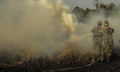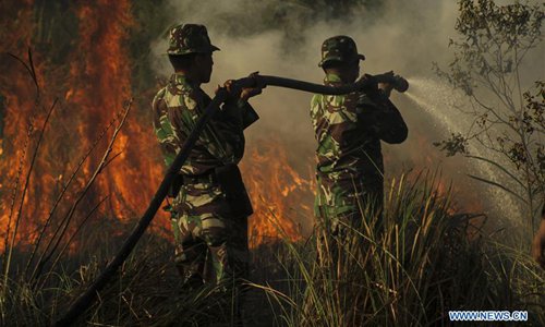 An Indonesian soldier and a firefighter try to extinguish peatland fire at Payung Sekaki, Pekanbaru, Riau, Indonesia, July 20, 2019. A joint team from local firefighters, police and military officers tried to extinguish forest fire several days ago. (Xinhua/Hadly Vavaldi)