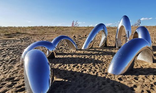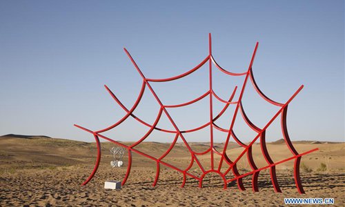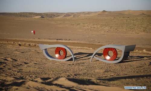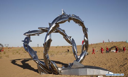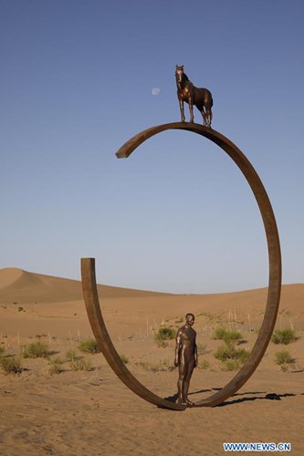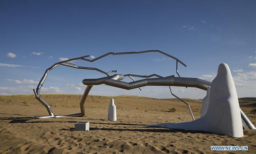 Photo taken on July 19, 2019 shows a sculpture work during a creation camp in Minqin County of Wuwei City, northwest China's Gansu Province. The Second Desert Sculpture International Creation Camp kicked off in Minqin on Saturday. A total of 46 sculpture works from 20 countries and regions are displayed during the camp. (Xinhua/Zhang Zhimin)