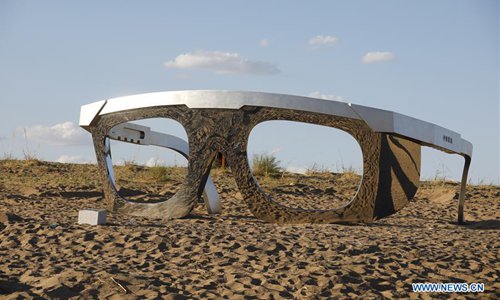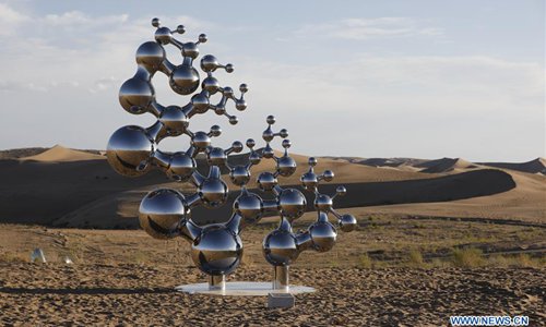Photo taken on July 20, 2019 shows a sculpture work during a creation camp in Minqin County of Wuwei City, northwest China's Gansu Province. The Second Desert Sculpture International Creation Camp kicked off in Minqin on Saturday. A total of 46 sculpture works from 20 countries and regions are displayed during the camp. (Xinhua/Zhang Zhimin)