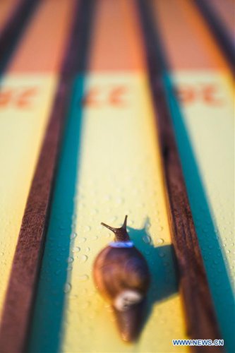 A snail competes in the 8th Croatian Snail Race Championship in Benkovac, Croatia, on July 20, 2019. (Xinhua/Marko Dimic)