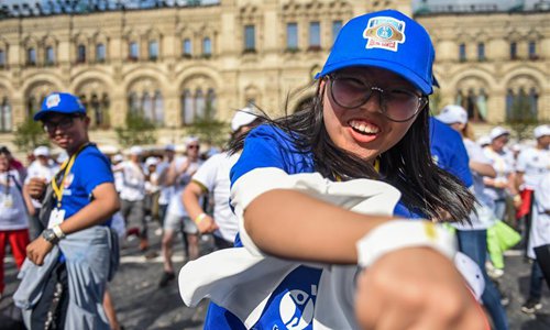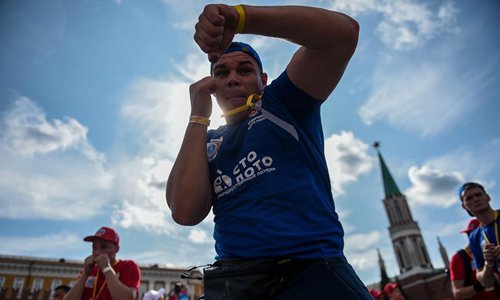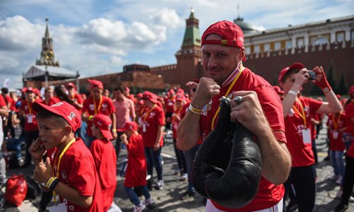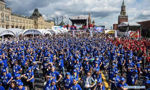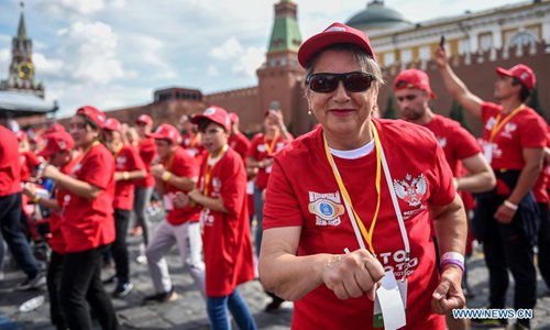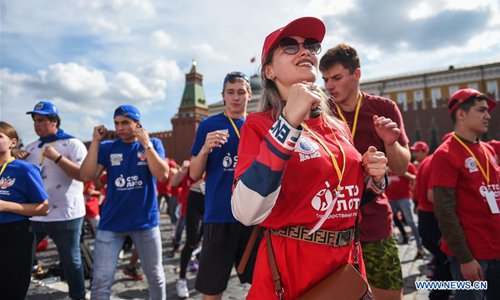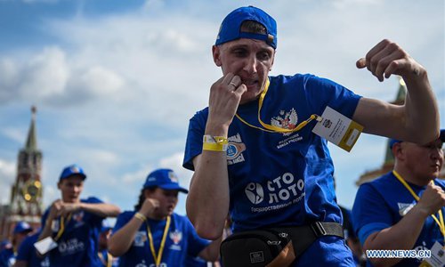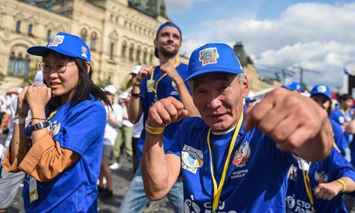 People participate in the public boxing practice in Moscow, Russia, on July 21, 2019. Over 4000 people took part in a boxing training session during the 3rd international boxing day on Red Square, trying to break the Guinness World Record for Mass Boxing Training. (Xinhua/Evgeny Sinitsyn)