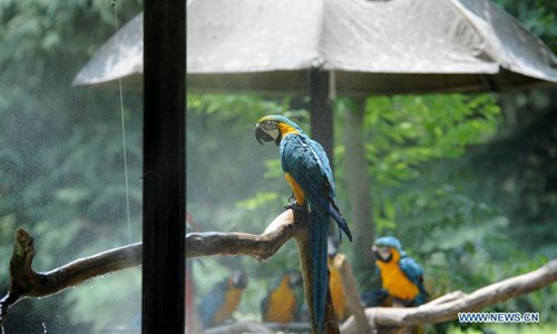 Macaws cool off amid water spray fogs under sun shelters at the Shanghai Zoo in east China's Shanghai, July 21, 2019. Measures have been taken by the Shanghai Zoo to help its animals fend off the summer heatwave. (Xinhua/Zhang Jiansong)
