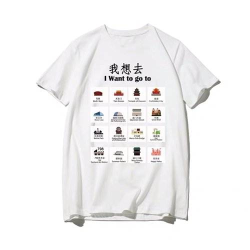 One of the T-shirts has the words and Chinese characters reading: "I want to go to," below which are pictures of Beijing's famous scenic places including the Bird's Nest, the Forbidden City and the Great Wall with their names in Chinese and English, according to a photo posted on Weibo.
