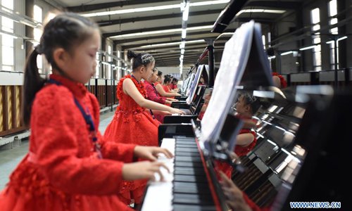 Children play the pianos during a public welfare event to care for children with visual impairment in Wuqiang County, north China's Hebei Province, Oct. 6, 2018. (Xinhua/Zhang Shuo)