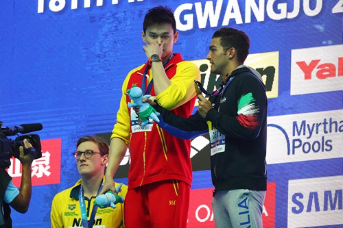 Gold medalist Sun Yang of China, silver medalist Mack Horton of Australia, and bronze medalist Gabriele Detti of Italy pose during the medal ceremony for Men's 400m Freestyle Final on day one of the Gwangju 2019 FINA World Championships at Nambu International Aquatics Centre on Sunday in Gwangju, South Korea. Photo: VCG