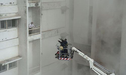 Firefighters rescue a man trapped by a fire in a nine-story building in Mumbai, India on Monday. The fire broke out at the building, which houses state-run telecom company MTNL, on Monday afternoon and up to 100 people, 84 of them stranded on its terrace, were rescued in one of the biggest operations in recent times. Photo: VCG