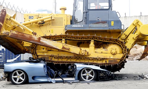 A bulldozer crushes a smuggled Ferrari sports car to prevent illicit trade and other customs fraud on Tuesday in Manila. Philippine President Rodrigo Duterte on Monday listed the Customs Bureau as one of the most corrupt government agencies in the country and has asked more than five dozen officials to resign. Photo: AP