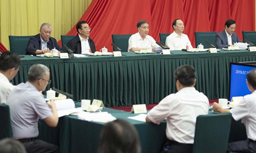 Wang Yang, a member of the Standing Committee of the Political Bureau of the Communist Party of China (CPC) Central Committee and chairman of the Chinese People's Political Consultative Conference (CPPCC) National Committee, attends a special consultative conference on enhancing the public cultural service system in rural areas in Beijing, capital of China, July 23, 2019. (Xinhua/Li Tao)