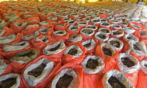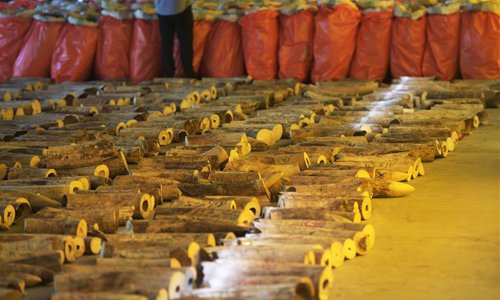 Photo shows the seized pangolin scales and elephant ivory in Singapore on July 23, 2019. In the joint statement issued by Singapore's National Parks Board (NParks), Singapore Customs and the Immigration & Checkpoints Authority (ICA), 11.9 tonnes of pangolin scales and 8.8 tonnes of elephant ivory were found in a container from the Democratic Republic of the Congo being shipped to Vietnam via Singapore. This is the largest seizure of elephant ivory in Singapore to date. (Xinhua/Then Chih Wey)
