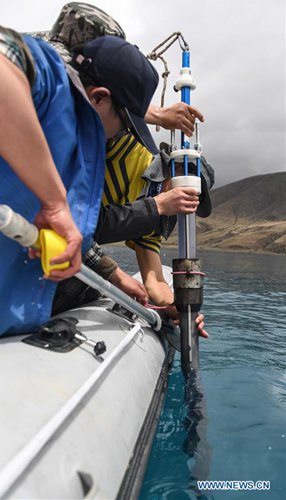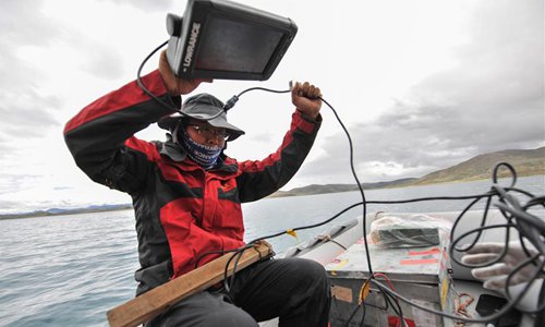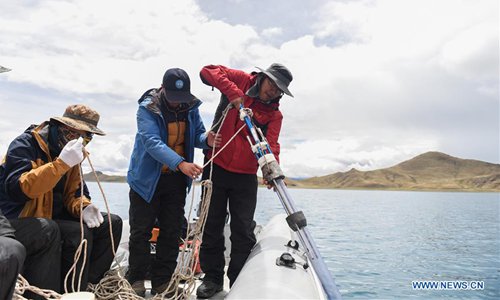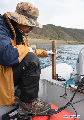 A member of a Chinese scientific expedition team checks the depth of Lake Yamzhog Yumco for survey in Nanggarze County of Shannan, southwest China's Tibet Autonomous Region, July 22, 2019. Chinese scientists are working on a survey to measure the depth of a major lake in southwest China's Tibet Autonomous Region, sources with the Chinese Academy of Sciences (CAS) said Tuesday. Lake Yamzhog Yumco with an area of about 590 square km is located in Nanggarze County in the city of Shannan. Yamzhog Yumco along with Lake Namtso and Lake Manasarovar are regarded as the three holy lakes of Tibet. (Xinhua/Jigme Dorje)