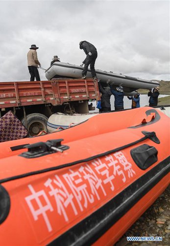 Members of a Chinese scientific expedition team prepare a rubber dinghy for survey in Nanggarze County of Shannan, southwest China's Tibet Autonomous Region, July 22, 2019. Chinese scientists are working on a survey to measure the depth of a major lake in southwest China's Tibet Autonomous Region, sources with the Chinese Academy of Sciences (CAS) said Tuesday. Lake Yamzhog Yumco with an area of about 590 square km is located in Nanggarze County in the city of Shannan. Yamzhog Yumco along with Lake Namtso and Lake Manasarovar are regarded as the three holy lakes of Tibet. (Xinhua/Jigme Dorje)