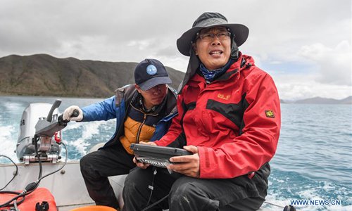 Members of a Chinese scientific expedition team take a boat via a navigation system to the main area of Lake Yamzhog Yumco for survey in Nanggarze County of Shannan, southwest China's Tibet Autonomous Region, July 22, 2019. Chinese scientists are working on a survey to measure the depth of a major lake in southwest China's Tibet Autonomous Region, sources with the Chinese Academy of Sciences (CAS) said Tuesday. Lake Yamzhog Yumco with an area of about 590 square km is located in Nanggarze County in the city of Shannan. Yamzhog Yumco along with Lake Namtso and Lake Manasarovar are regarded as the three holy lakes of Tibet. (Xinhua/Jigme Dorje)