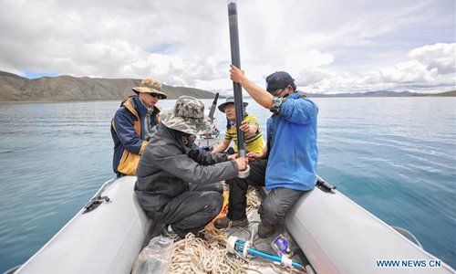 Members of a Chinese scientific expedition team use a drill to get the sediment core of Lake Yamzhog Yumco in Nanggarze County of Shannan, southwest China's Tibet Autonomous Region, July 22, 2019. Chinese scientists are working on a survey to measure the depth of a major lake in southwest China's Tibet Autonomous Region, sources with the Chinese Academy of Sciences (CAS) said Tuesday. Lake Yamzhog Yumco with an area of about 590 square km is located in Nanggarze County in the city of Shannan. Yamzhog Yumco along with Lake Namtso and Lake Manasarovar are regarded as the three holy lakes of Tibet. (Xinhua/Jigme Dorje)