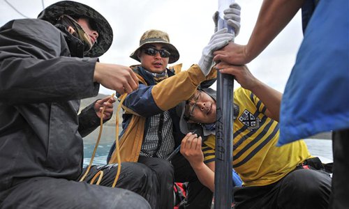 Members of a Chinese scientific expedition team mark the sediment core of Lake Yamzhog Yumco in Nanggarze County of Shannan, southwest China's Tibet Autonomous Region, July 22, 2019. Chinese scientists are working on a survey to measure the depth of a major lake in southwest China's Tibet Autonomous Region, sources with the Chinese Academy of Sciences (CAS) said Tuesday. Lake Yamzhog Yumco with an area of about 590 square km is located in Nanggarze County in the city of Shannan. Yamzhog Yumco along with Lake Namtso and Lake Manasarovar are regarded as the three holy lakes of Tibet. (Xinhua/Jigme Dorje)