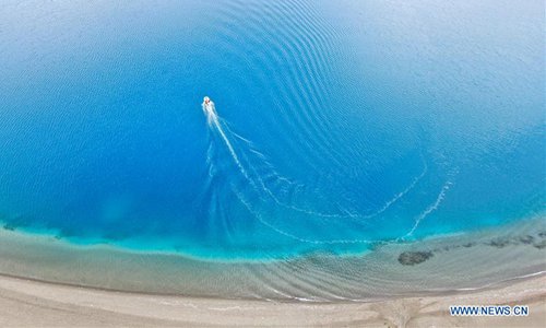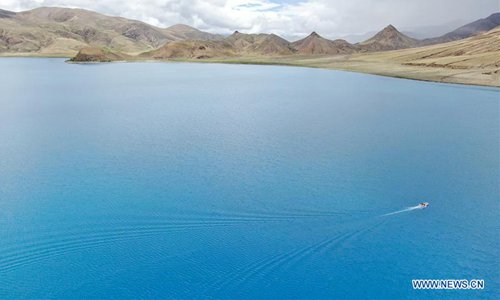 Aerial photo taken on July 22, 2019 shows a Chinese scientific expedition team taking a boat to the main area of Lake Yamzhog Yumco for survey in Nanggarze County of Shannan, southwest China's Tibet Autonomous Region. Chinese scientists are working on a survey to measure the depth of a major lake in southwest China's Tibet Autonomous Region, sources with the Chinese Academy of Sciences (CAS) said Tuesday. Lake Yamzhog Yumco with an area of about 590 square km is located in Nanggarze County in the city of Shannan. Yamzhog Yumco along with Lake Namtso and Lake Manasarovar are regarded as the three holy lakes of Tibet. (Xinhua/Jigme Dorje)