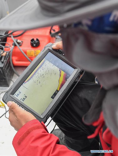 A member of a Chinese scientific expedition team detects underwater topography of Lake Yamzhog Yumco via a sonar device in Nanggarze County of Shannan, southwest China's Tibet Autonomous Region, July 22, 2019. Chinese scientists are working on a survey to measure the depth of a major lake in southwest China's Tibet Autonomous Region, sources with the Chinese Academy of Sciences (CAS) said Tuesday. Lake Yamzhog Yumco with an area of about 590 square km is located in Nanggarze County in the city of Shannan. Yamzhog Yumco along with Lake Namtso and Lake Manasarovar are regarded as the three holy lakes of Tibet. (Xinhua/Jigme Dorje)
