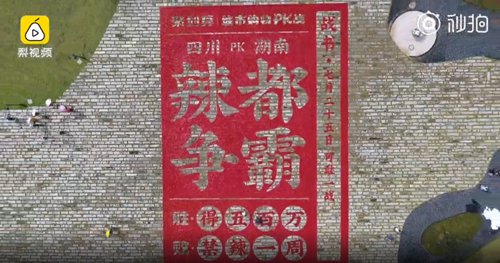 A humongous poster made of chili peppers in a park in Yiyang, Hunan, has thrown down the gauntlet to spice-loving Sichuan in a video posted by Pear Video on Sina Weibo on Tuesday.
