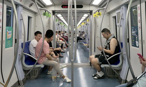 Passengers in a moving subway train in Beijing on July 19. Photo: IC