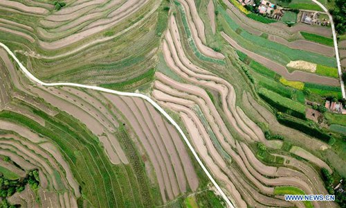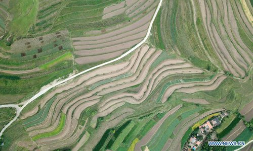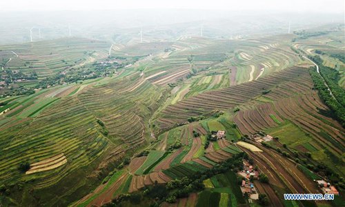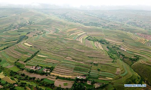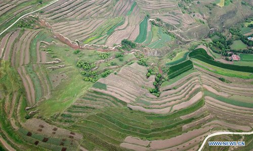 Aerial photo taken on July 24, 2019 shows the terraced lands in Zhongchuan Town of Huining County, northwest China's Gansu Province. (Xinhua/Ma Ning)