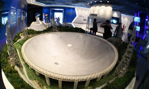 Visitors watch the FAST model at the astronomical museum in Pingtang during summer vacation in southwest China's Guizhou Province, July 24, 2019. (Xinhua/Yang Wenbin)