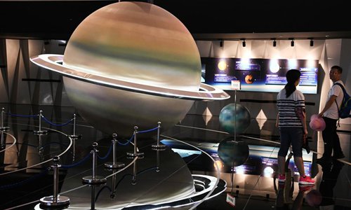 Visitors watch the solar system models at the astronomical museum in Pingtang during summer vacation in southwest China's Guizhou Province, July 24, 2019. (Xinhua/Yang Wenbin)