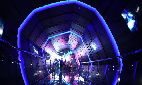 Visitors experience the virtual space module during at the astronomical museum in Pingtang during summer vacation in southwest China's Guizhou Province, July 24, 2019. (Xinhua/Yang Wenbin)