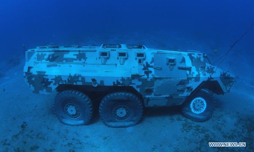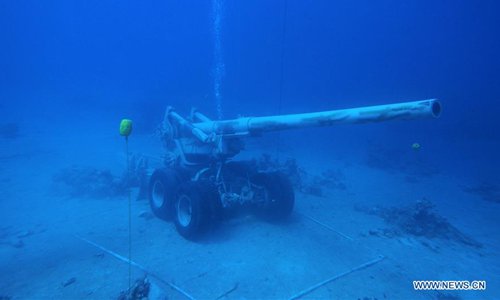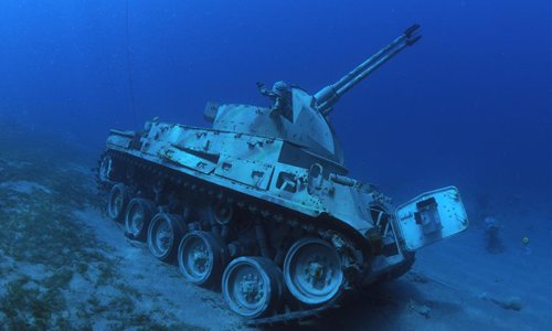 Handout photo obtained on July 23, 2019 shows a Jordanian Armed Forces armoured vehicle lying on the seabed of the Red Sea as part of a new underwater military museum off the coast of the southern port city of Aqaba, Jordan. The museum is built by Aqaba Special Economic Zone to attract more tourists in summer, (Aqaba Special Economic Zone/Handout via Xinhua)