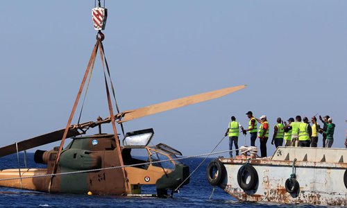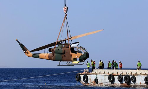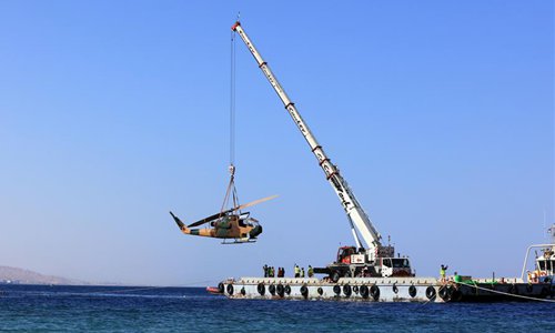 A body of a military helicopter, donated by the Jordanian Royal Air Force, is submerged in the Red Sea off Aqaba, as part of a new underwater military museum, in south Jordan, July 24, 2019. The museum is built by Aqaba Special Economic Zone to attract more tourists in summer, (Photo by Mohammad Abu Ghosh/Xinhua)