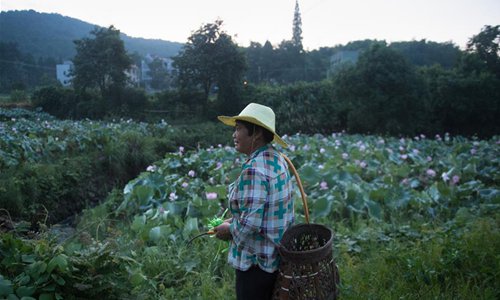 A villager picks lotus flowers in Shuangquan Village of Jiande City, east China's Zhejiang Province, July 25, 2019. Well-known for lotus, Shuangquan Village promotes lotus industry centered with products including lotus seeds, lotus roots powder and lotus leaf tea, and has boosted villagers' incomes. (Xinhua/Weng Xinyang)