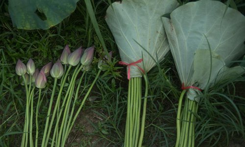 Photo taken on July 25, 2019 shows harvested lotus flowers in Shuangquan Village of Jiande City, east China's Zhejiang Province. Well-known for lotus, Shuangquan Village promotes lotus industry centered with products including lotus seeds, lotus roots powder and lotus leaf tea, and has boosted villagers' incomes. (Xinhua/Weng Xinyang)