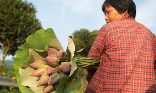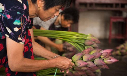 A villager packs lotus flowers in Shuangquan Village of Jiande City, east China's Zhejiang Province, July 25, 2019. Well-known for lotus, Shuangquan Village promotes lotus industry centered with products including lotus seeds, lotus roots powder and lotus leaf tea, and has boosted villagers' incomes. (Xinhua/Weng Xinyang)