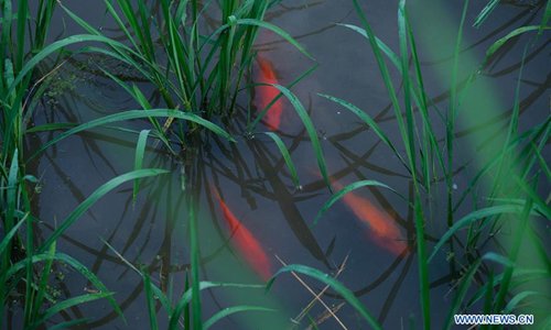 Photo taken on July 25, 2019 shows fish bred by farmers in rice fields in Xiaozhoushan Township of Qingtian County, east China's Zhejiang Province. Since 2013, following the principle of green development, local authorities have been giving full play to over 4,000 mu (about 267 hectares) terraced fields. By relying on a history of over 1,000 years in raising fish in paddy field, Qingtian county promotes integration of agriculture, tourism and culture to develop sustainable agriculture and countryside tourism, and boost farmers' income. (Photo: Xinhua)