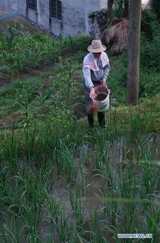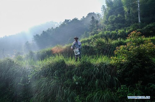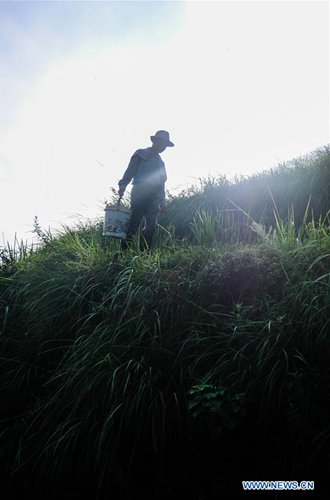 A farmer feeds fish in rice fields in Xiaozhoushan Township of Qingtian County, east China's Zhejiang Province, July 25, 2019. Since 2013, following the principle of green development, local authorities have been giving full play to over 4000 mu (about 267 hectares) terraced fields. By relying on agriculture with a history over 1000 years, Qingtian county promotes integration of agriculture, tourism and culture to develop sustainable agriculture and countryside tourism, and boost farmers' income. (Photo: Xinhua)