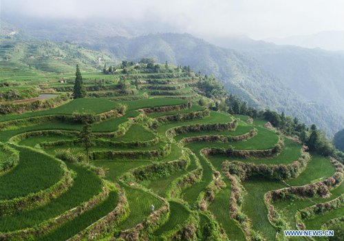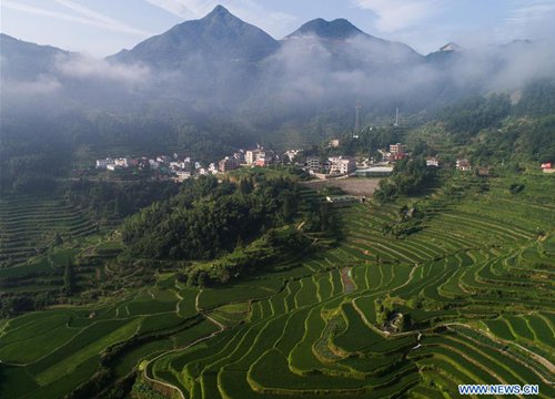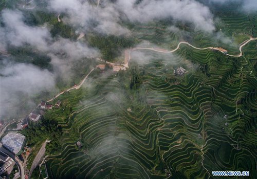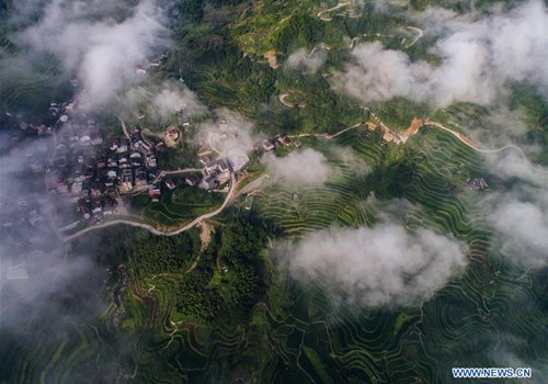 Aerial photo taken on July 25, 2019 shows terraced fields, where farmers breed fish, in Xiaozhoushan Township of Qingtian County, east China's Zhejiang Province. Since 2013, following the principle of green development, local authorities have been giving full play to over 4000 mu (about 267 hectares) terraced fields. By relying on agriculture with a history over 1000 years, Qingtian county promotes integration of agriculture, tourism and culture to develop sustainable agriculture and countryside tourism, and boost farmers' income. (Photo: Xinhua)