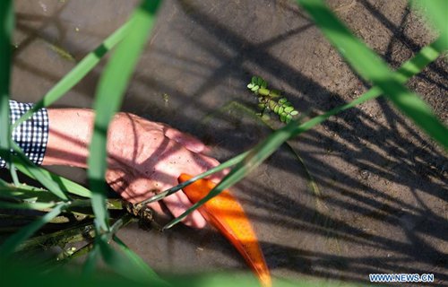 A farmer catches fish from the rice fields in Xiaozhoushan Township of Qingtian County, east China's Zhejiang Province, July 25, 2019. Since 2013, following the principle of green development, local authorities have been giving full play to over 4000 mu (about 267 hectares) terraced fields. By relying on agriculture with a history over 1000 years, Qingtian county promotes integration of agriculture, tourism and culture to develop sustainable agriculture and countryside tourism, and boost farmers' income. (Photo: Xinhua)