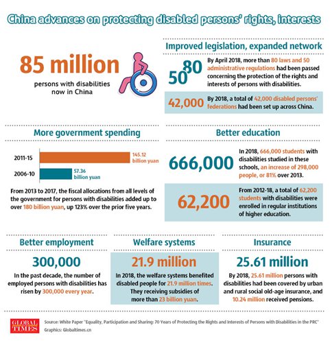 According to the white paper released by the State Council Information Office, the number of people living with disabilities, stands around 85 million, accounts for about 6 percent of China's population.