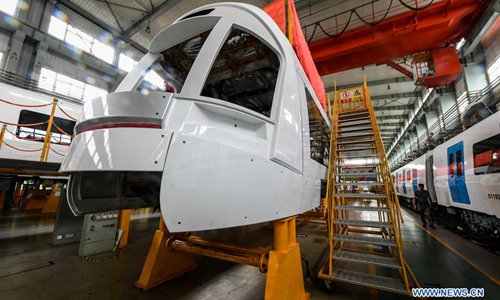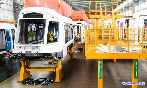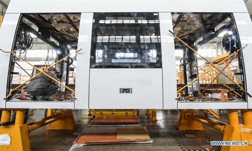 Photo taken on July 25, 2019 shows explosion-proof light rail trains being manufactured jin CRRC Changchun Railway Vehicles Co., Ltd. in Changchun, capital of northeast China's Jilin Province. An explosion-proof light rail train that will be exported to Israel rolled off the assembly line in the northeastern Chinese city of Changchun on Tuesday. The train, manufactured by CRRC Changchun Railway Vehicles Co., Ltd., will be used for the red line of the light rail system in the Israeli city of Tel Aviv. The 23-km line is schedule to be put into operation in 2021. The train's underframe structure is made of non-ferromagnetic material, which can prevent magnetic bombs from being attached to it. The windows are equipped with explosion-proof glass that can withstand the impact of stones and burning bottles. (Xinhua/Wang Haofei)