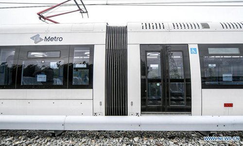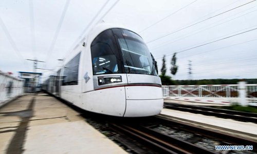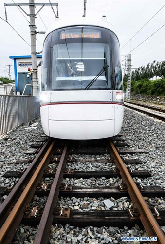 An explosion-proof light rail train undergoes a test in CRRC Changchun Railway Vehicles Co., Ltd. in Changchun, capital of northeast China's Jilin Province, July 25, 2019. An explosion-proof light rail train that will be exported to Israel rolled off the assembly line in the northeastern Chinese city of Changchun on Tuesday. The train, manufactured by CRRC Changchun Railway Vehicles Co., Ltd., will be used for the red line of the light rail system in the Israeli city of Tel Aviv. The 23-km line is schedule to be put into operation in 2021. The train's underframe structure is made of non-ferromagnetic material, which can prevent magnetic bombs from being attached to it. The windows are equipped with explosion-proof glass that can withstand the impact of stones and burning bottles. (Xinhua/Wang Haofei)