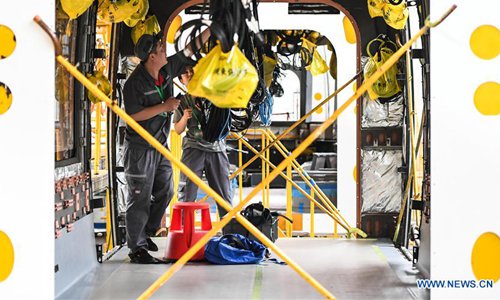 Workers connect wires for a carriage of an explosion-proof light rail train at a workshop of CRRC Changchun Railway Vehicles Co., Ltd. in Changchun, capital of northeast China's Jilin Province, July 25, 2019. An explosion-proof light rail train that will be exported to Israel rolled off the assembly line in the northeastern Chinese city of Changchun on Tuesday. The train, manufactured by CRRC Changchun Railway Vehicles Co., Ltd., will be used for the red line of the light rail system in the Israeli city of Tel Aviv. The 23-km line is schedule to be put into operation in 2021. The train's underframe structure is made of non-ferromagnetic material, which can prevent magnetic bombs from being attached to it. The windows are equipped with explosion-proof glass that can withstand the impact of stones and burning bottles. (Xinhua/Wang Haofei)