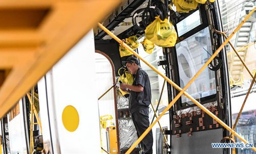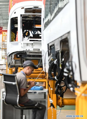 A worker connects wires for a carriage of an explosion-proof light rail train at a workshop of CRRC Changchun Railway Vehicles Co., Ltd. in Changchun, capital of northeast China's Jilin Province, July 25, 2019. An explosion-proof light rail train that will be exported to Israel rolled off the assembly line in the northeastern Chinese city of Changchun on Tuesday. The train, manufactured by CRRC Changchun Railway Vehicles Co., Ltd., will be used for the red line of the light rail system in the Israeli city of Tel Aviv. The 23-km line is schedule to be put into operation in 2021. The train's underframe structure is made of non-ferromagnetic material, which can prevent magnetic bombs from being attached to it. The windows are equipped with explosion-proof glass that can withstand the impact of stones and burning bottles. (Xinhua/Wang Haofei)