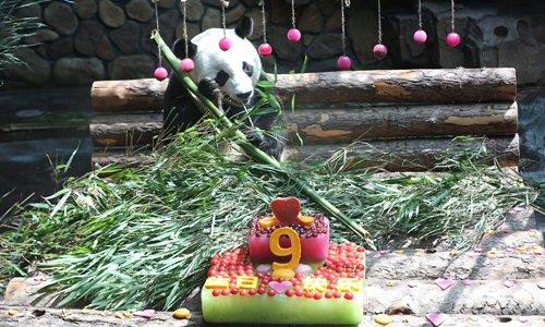 A male giant panda named Er Xi enjoys a bamboo shoot and a giant birthday cake made of ice and fruits prepared by zoo employees in Ji'nan, East China's Shandong Province, on Friday, his 9th birthday. Photo: VCG