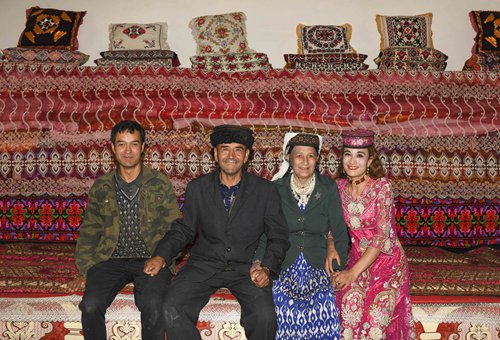 A family pose for photos at their new house in Datong Township, Tajik Autonomous County of Taxkorgan, northwest China's Xinjiang Uygur Autonomous Region, June 17, 2019. (Photo: Xinhua)