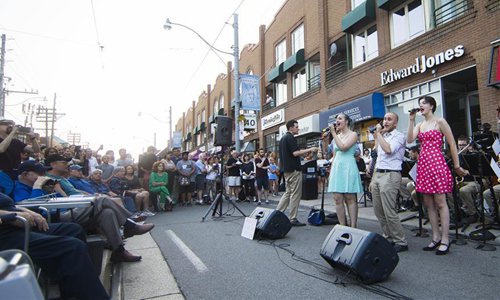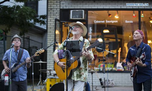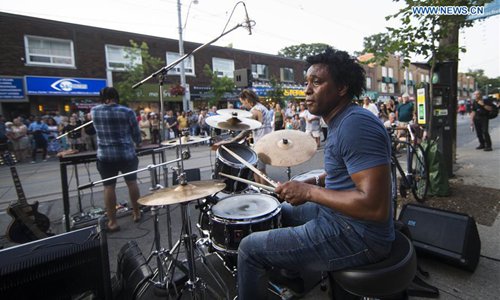 A band performs during the Streetfest of the 2019 Beaches International Jazz Festival in Toronto, Canada, July 26, 2019. As a part of Beaches International Jazz Festival, the annual street festival was held here from Thursday to Saturday with participation of 43 bands from around the world and tens of thousands of music enthusiasts. The 2019 Beaches International Jazz Festival kicked off on July 5 and will close on July 28. (Xinhua/Zou Zheng)