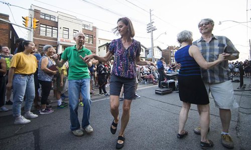 People dance as a band performs nearby during the Streetfest of the 2019 Beaches International Jazz Festival in Toronto, Canada, July 26, 2019. As a part of Beaches International Jazz Festival, the annual street festival was held here from Thursday to Saturday with participation of 43 bands from around the world and tens of thousands of music enthusiasts. The 2019 Beaches International Jazz Festival kicked off on July 5 and will close on July 28. (Xinhua/Zou Zheng)