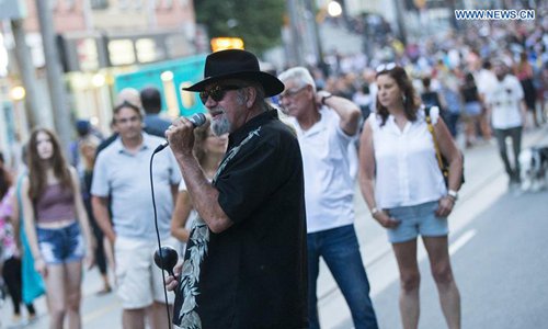 A man performs during the Streetfest of the 2019 Beaches International Jazz Festival in Toronto, Canada, July 26, 2019. As a part of Beaches International Jazz Festival, the annual street festival was held here from Thursday to Saturday with participation of 43 bands from around the world and tens of thousands of music enthusiasts. The 2019 Beaches International Jazz Festival kicked off on July 5 and will close on July 28. (Xinhua/Zou Zheng)