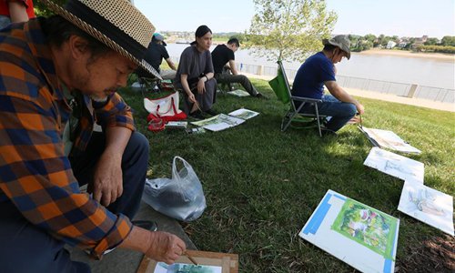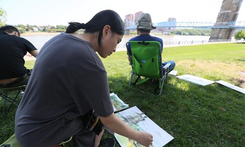 Chinese artists who take part in the Cincinnati/Liuzhou Paint Out Program sketch at the Smale Riverfront Park in Cincinnati of Ohio, the United States, July 25, 2019. Chinese and U.S. artists recently took part in the Cincinnati/Liuzhou Paint Out Program, in which artists from south China's Guangxi Zhuang Autonomous Region were invited to visit Cincinnati for a week. They visited museums and galleries, exchanged art views and techniques with their U.S. counterparts, and presented a joint exhibition. Cincinnati and Liuzhou celebrated their 30th anniversary of the establishment of sister city relations last year. (Xinhua/Zhang Fengguo)