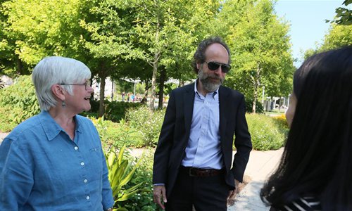 Jan Brown Checco (L), lead artist of the Cincinnati/Liuzhou Paint Out Program, talks with Joe Hamrick (C), chairman of the Cincinnati-Liuzhou Sister City Committee, in Cincinnati of Ohio, the United States, July 25, 2019. Chinese and U.S. artists recently took part in the Cincinnati/Liuzhou Paint Out Program, in which artists from south China's Guangxi Zhuang Autonomous Region were invited to visit Cincinnati for a week. They visited museums and galleries, exchanged art views and techniques with their U.S. counterparts, and presented a joint exhibition. Cincinnati and Liuzhou celebrated their 30th anniversary of the establishment of sister city relations last year. (Xinhua/Zhang Fengguo)