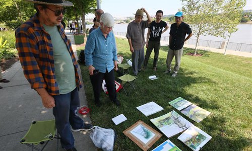 Jan Brown Checco (2nd L), lead artist of the Cincinnati/Liuzhou Paint Out Program, views the drawings of Chinese artists, at the Smale Riverfront Park in Cincinnati of Ohio, the United States, July 25, 2019. Chinese and U.S. artists recently took part in the Cincinnati/Liuzhou Paint Out Program, in which artists from south China's Guangxi Zhuang Autonomous Region were invited to visit Cincinnati for a week. They visited museums and galleries, exchanged art views and techniques with their U.S. counterparts, and presented a joint exhibition. Cincinnati and Liuzhou celebrated their 30th anniversary of the establishment of sister city relations last year. (Xinhua/Zhang Fengguo)